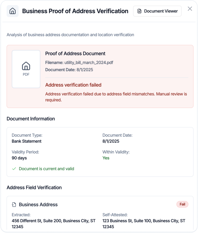 Verify individual proof of residence documents including utility bills, bank statements, and government correspondence for personal address validation. Automatically validates document authenticity and address consistency for KYC compliance.