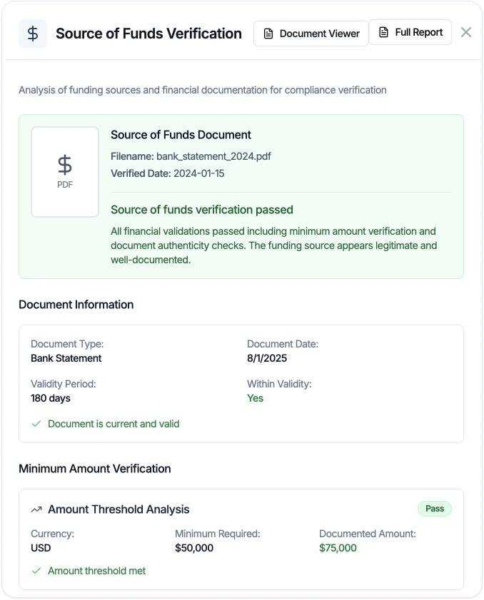 Verify the authenticity of source of funds documentation including bank statements, employment records, and investment documents. Automatically validates document legitimacy and ensures funds originate from legitimate sources for AML compliance.